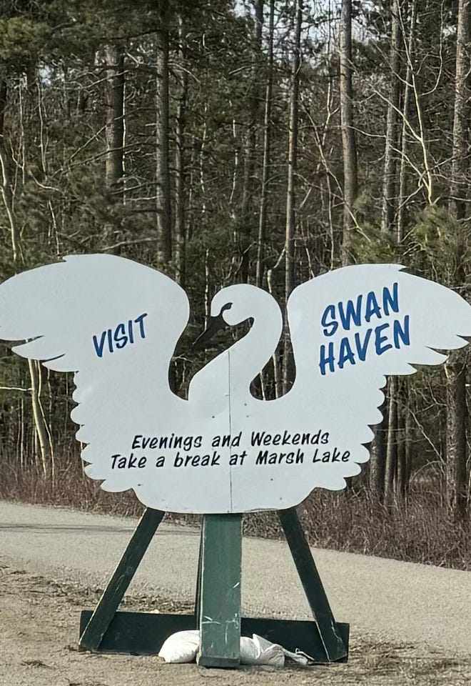 I didn’t make it to Swan Haven. Instead I saw the bird-shaped signs off the highway: Take a break at Marsh Lake. Pictured someone assembling their wooden wings and breaking them apart. Remembered feeding the swans of my childhood a bag of Wonder Bread, ripping the pieces smaller and smaller so they wouldn’t choke. Dreamed of them forcing their long necks through the windows of my grandparents’ car, where I sat, snapping their beaks in my hands.